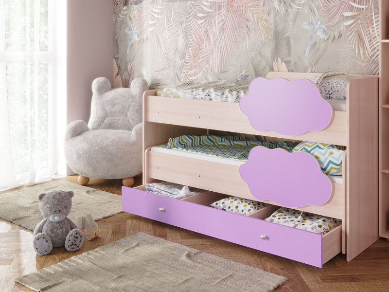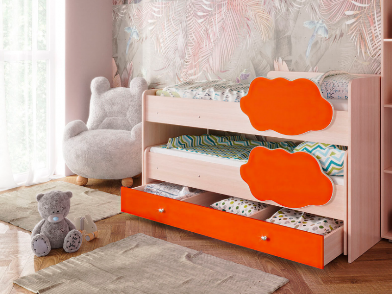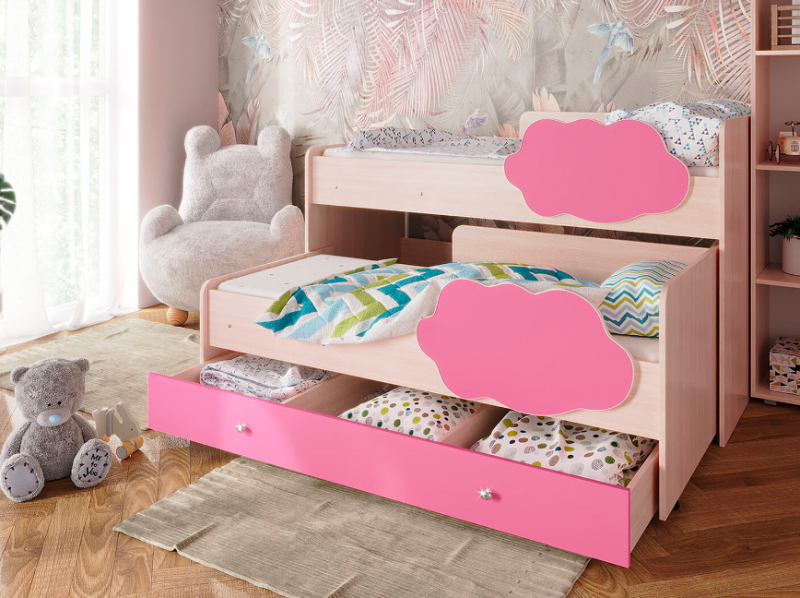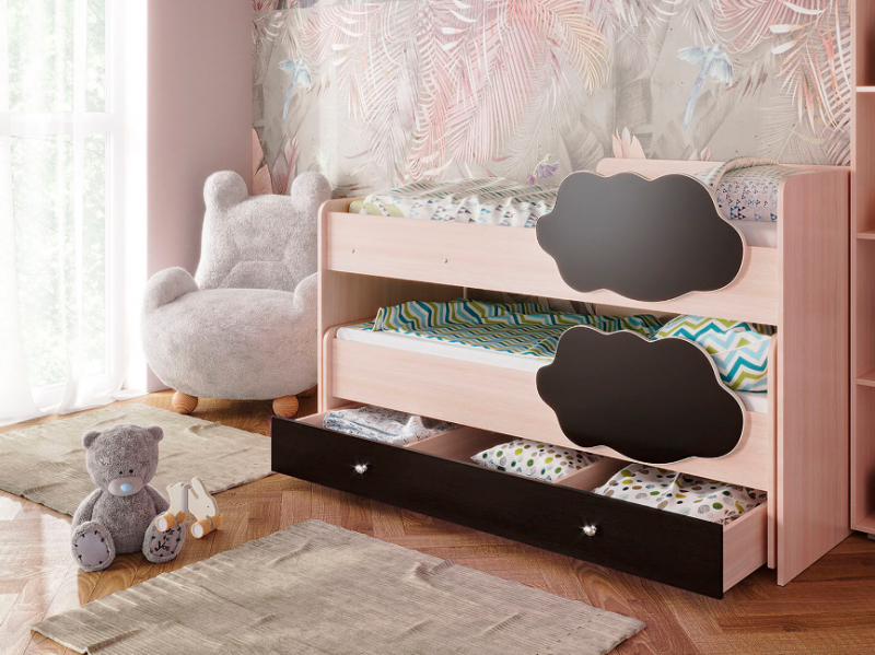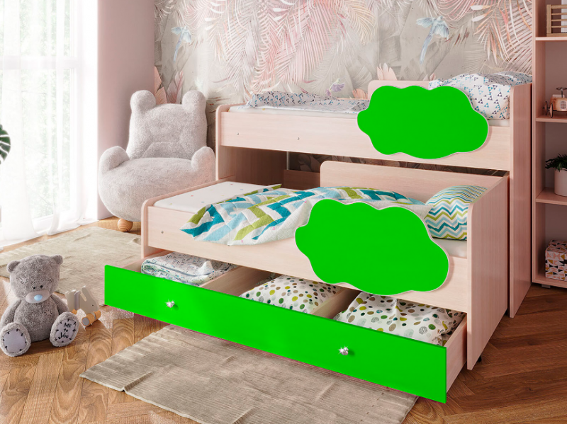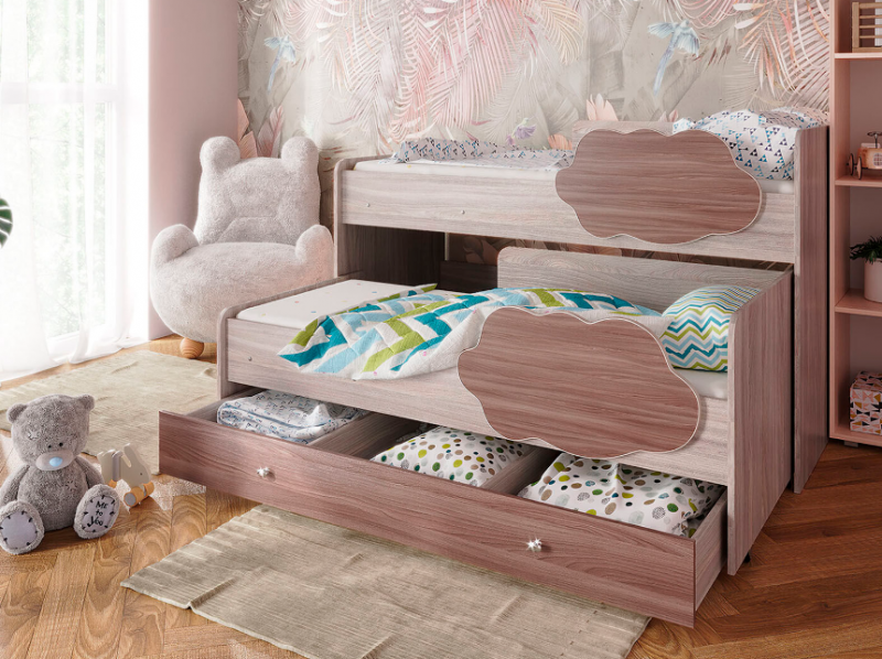 Выкатная двухъярусная кровать «Соник», которая занимает минимум полезной площади. Экономия пространства в комнате — является главным преимуществом такой конструкции, где есть двое детей.