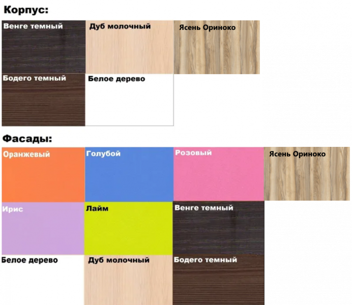 Цвет фасадов: Розовый, Оранжевый, Голубой, Лайм, Ирис, Винтерберг, Ясень Анкор темный, Дуб Молочный, Дерево белое