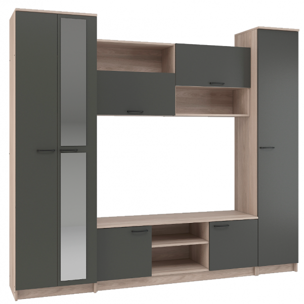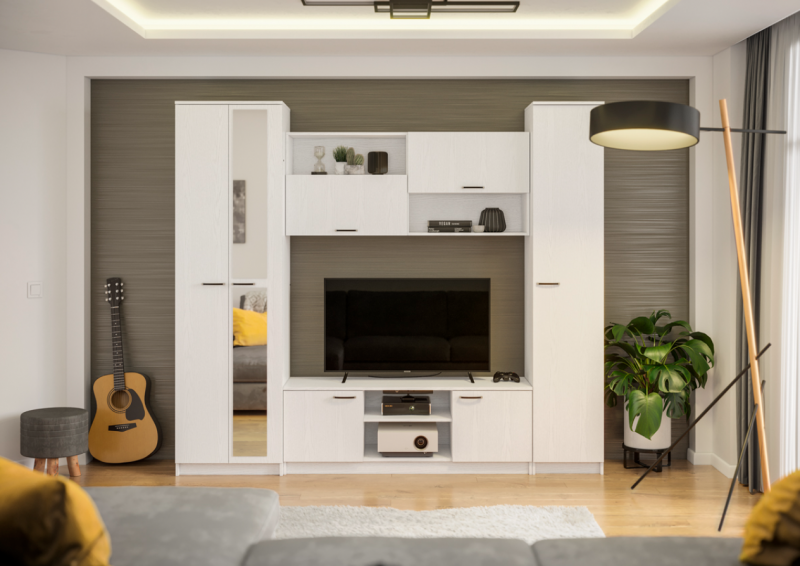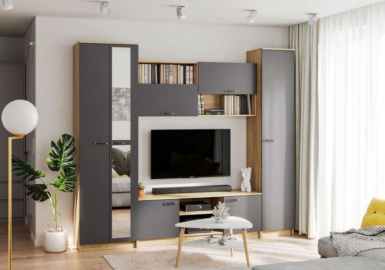 - Гостиная состоит из бельевого шкафа, средней секции и платяного шкафа