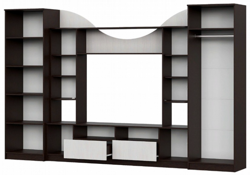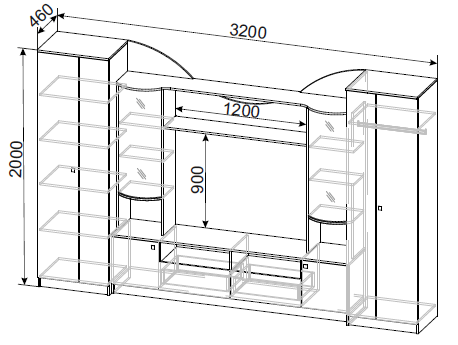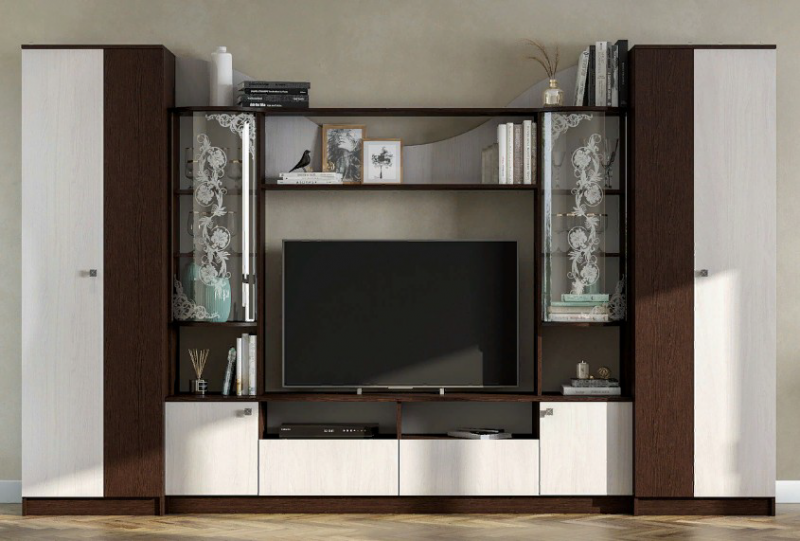 внутренним размером 368х300х361мм, сверху секция с распашной стеклянной створкой внутренним размером 368х912х361мм. В секции со стеклостворкой устанавливаются по две полки из ЛДСП. В нишу между пеналами можно установить телевизор с диагональю до 46 дюймов.