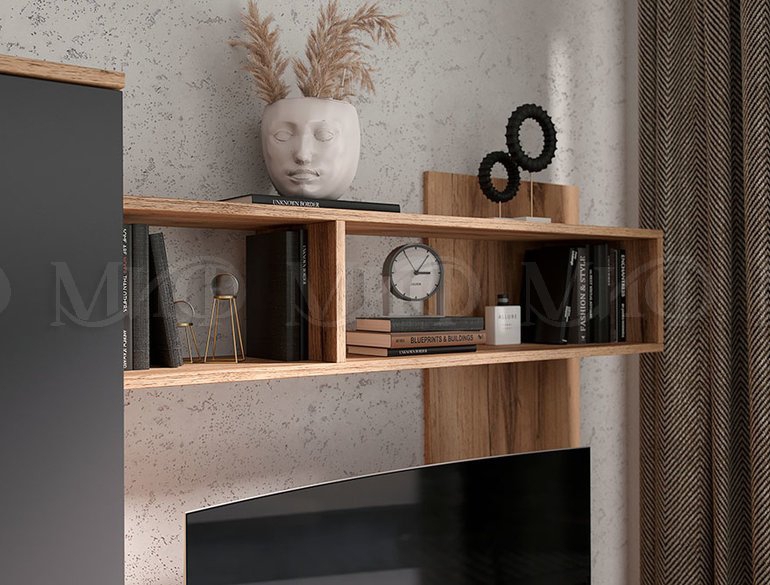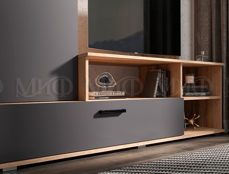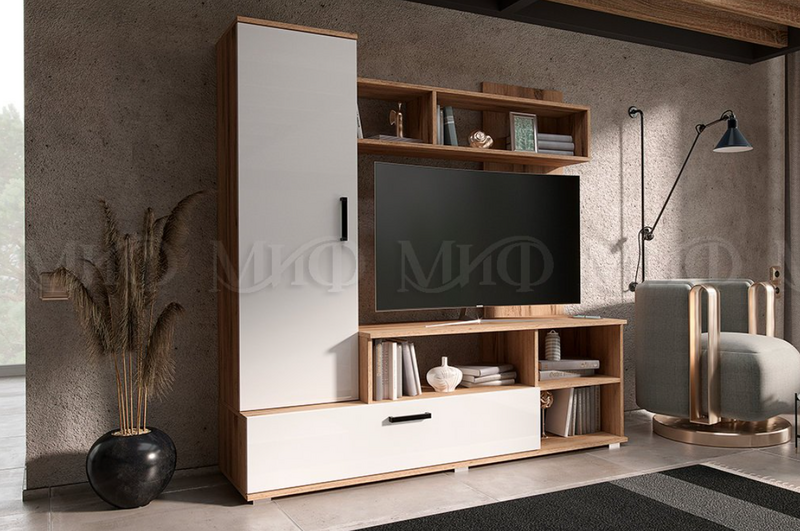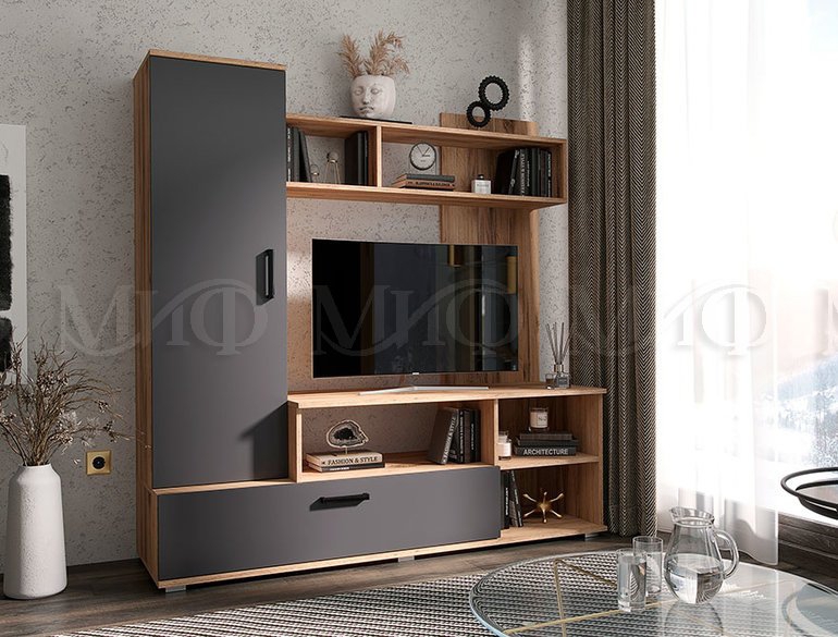 Миниатюрная стенка "Мини" в неповторимом стиле, с местом под большой телевизор. Она вместит в себя все самое необходимое. Современное удобное решение для маленькой гостиной или спальной комнаты.