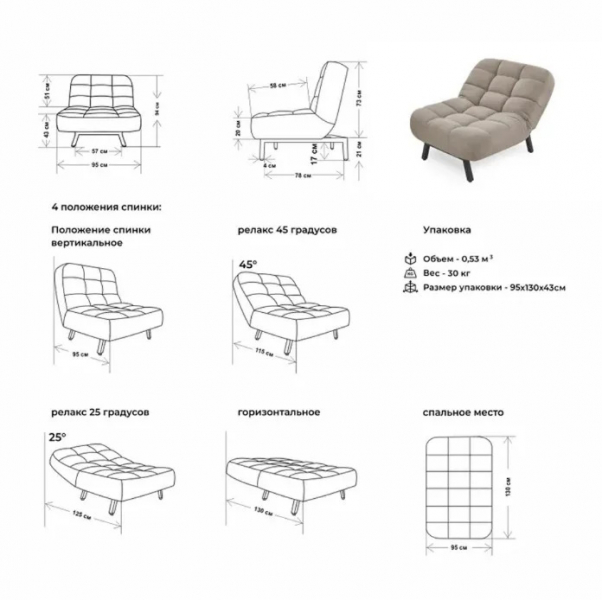 Спальное место: 950х1300 мм, совпестно с пуфом Арби образует полноценное спальное место