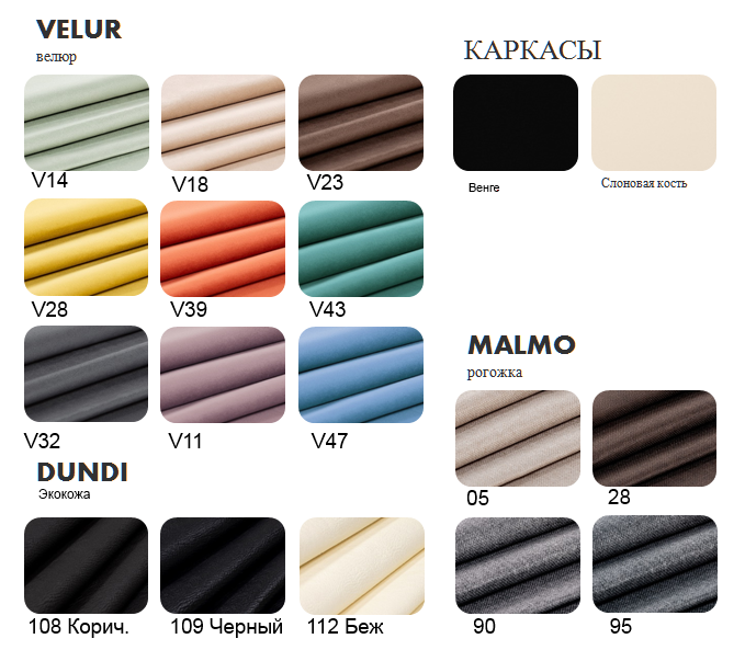 Обивка: Малмо 05, Малмо 28, Малмо 95, V-14, V-18, V-23, V-28, V-39, V-11, V-32, V-43, V-47, Экокожа Dundi 108, Экокожа 109, Экокожа 112