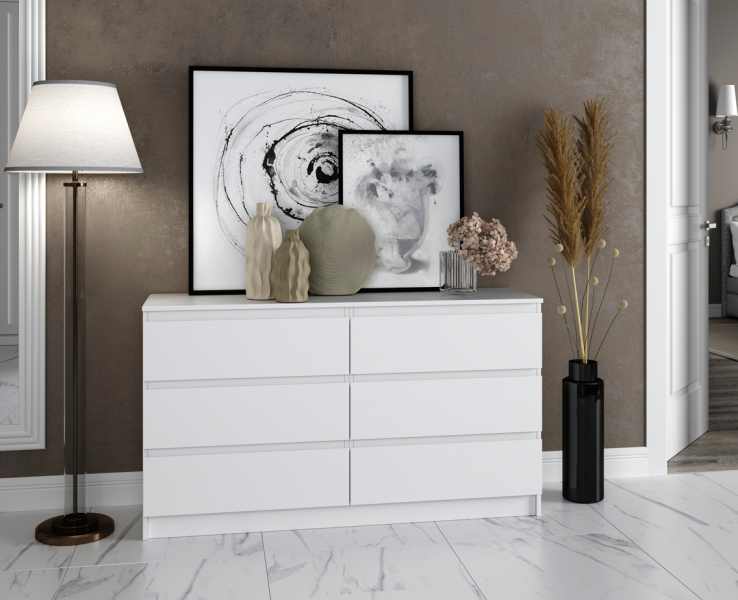 Белый цвет модульной системы мебели не теряет со временем свой цвет и будет радовать владельца приятным теплым оттенком. В качестве материалов используются долговечные материалы, которые соответствуют высоким экологическим стандартам. Ручки отсутствуют (открывание за счет пространства между планками и фасадом).