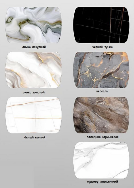 Цвет: Оникс лазурный/Белый, Оникс золотой/Белый, Белый Каспий/Белый, Черный Тунис/Черный, Версаль/Черный, Паладина коричневая/Черный, Мрамор Итальянский/Черный