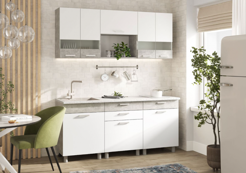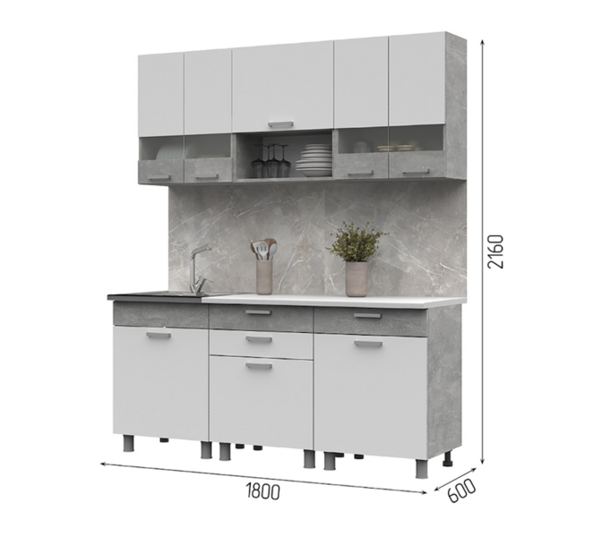 Габаритные размеры нижних модулей с учетом высоты опор и столешницы ШхВхГ - 1800х842х600 мм
