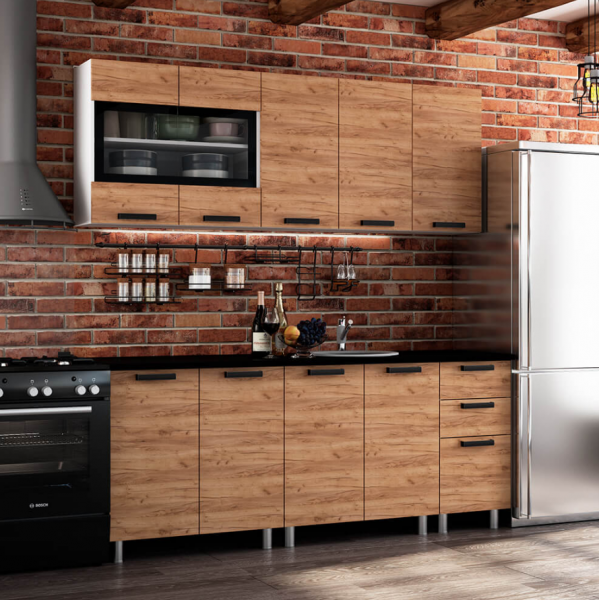 Фактурный древесный декор фасадов кухни "Крафт" отсылает к природной естественности и грации, а черные элементы создают яркие акценты, привлекающие к себе внимание. Четкие геометрические линии, массивные ручки под металл и фасады под дерево помогают отступить от стандартных шаблонов оформления кухонного пространства, обустроив у Вас дома воплощение изящества и элегантности!