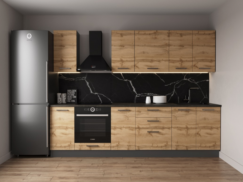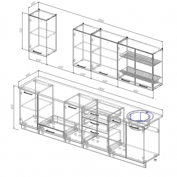 Фасады верхних модулей со свесом 12 мм дают возможность использовать без установки ручек.