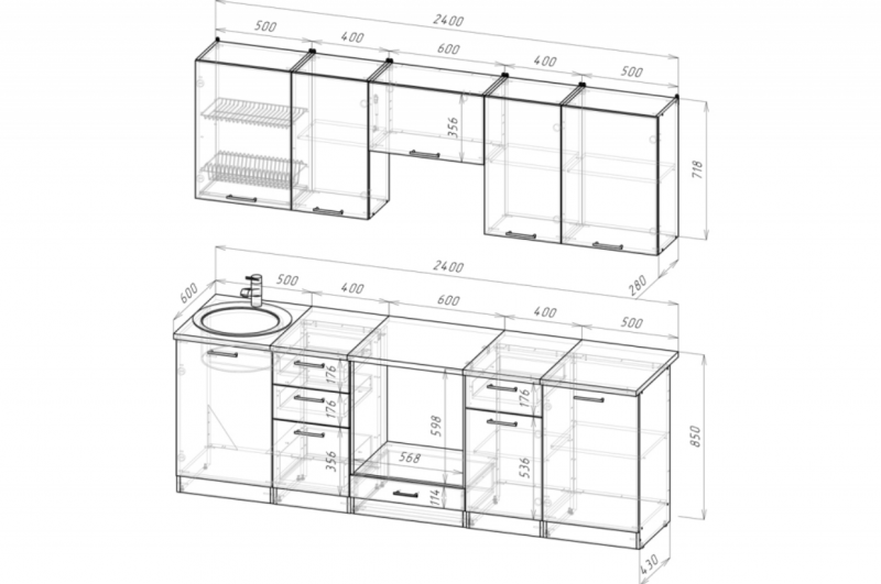 Сушка и врезная мойка приобретаются отдельно. Столешница раздельная на каждый модуль своя, есть возможность заказа цельной ОБЯЗАТЕЛЬНО сообщайте об этом менеджеру либо в коментарии к заказу
