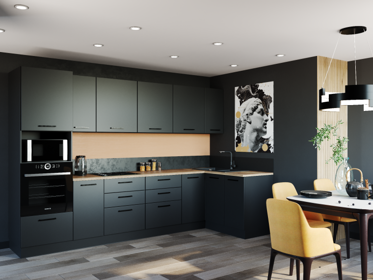 Фасады верхних модулей со свесом 12 мм дают возможность использовать без установки ручек.
