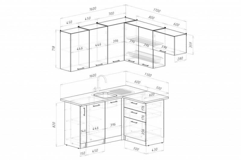 Сушка и врезная мойка приобретаются отдельно. столешница сплошная на 1600+500