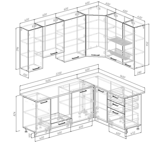 Фасады верхних модулей со свесом 12 мм дают возможность использовать без установки ручек.