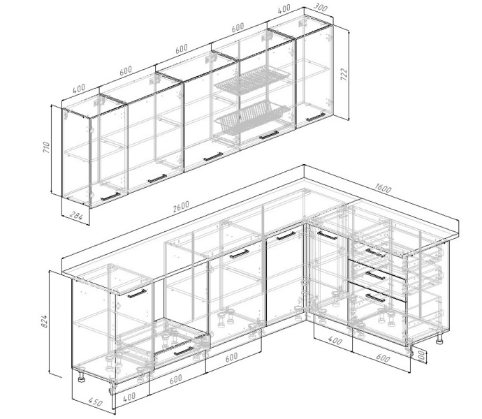 Фасады верхних модулей со свесом 12 мм дают возможность использовать без установки ручек.
