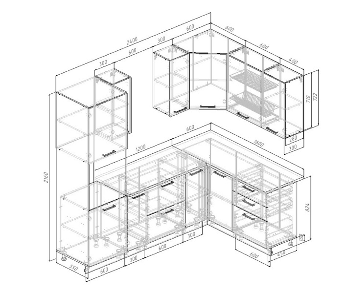 Фасады верхних модулей со свесом 12 мм дают возможность использовать без установки ручек.