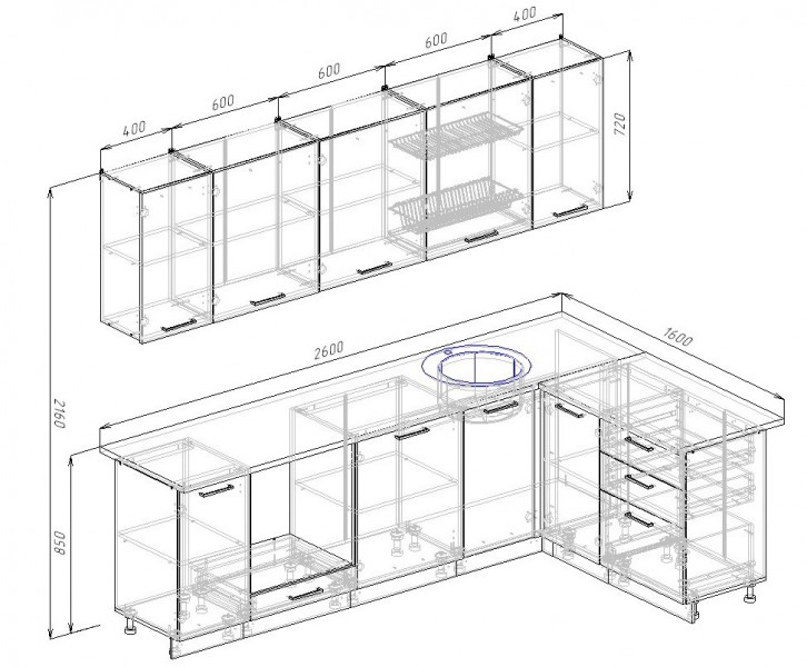 Фасады верхних модулей со свесом 12 мм дают возможность использовать без установки ручек.