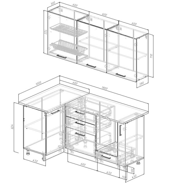 Фасады верхних модулей со свесом 12 мм дают возможность использовать без установки ручек.