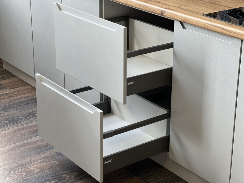 Многократно испытанные направляющие ящиков TANDEMBOX впечатляют высоким комфортом движения. Износостойкие пластмассовые валики обеспечивают плавное скольжение и динамические нагрузки 30 кг и 65 кг. Адаптивная система BLUMOTION обеспечивает мягкое и бесшумное закрывание.