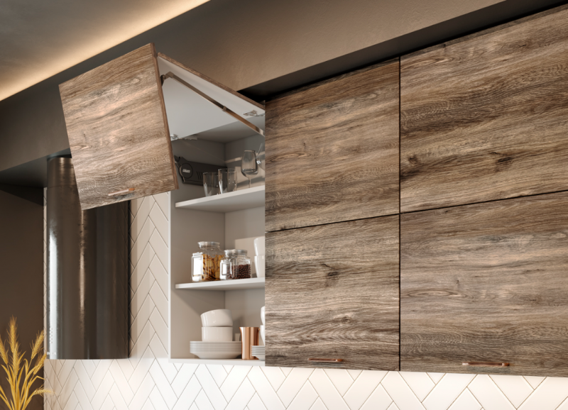 Складной подъемный механизм AVENTOS HF обеспечивает высокий комфорт движения в области верхних шкафов. Даже широкие фасады открываются без усилий, останавливаются в любом положении и мягко и бесшумно закрываются. Фасады модулей с этим подъёмником при открывании складываются посередине и обеспечивают хороший доступ к содержимому. Складной подъемный механизм AVENTOS HF идеально подходит для модулей ПГПМ и ВПГПМ. Даже большие фасады легко поднимаются и предоставляют достаточно свободного пространства над головой. Это идеальное решение для высоких фасадов в верхнем шкафу, состоящих из двух частей.