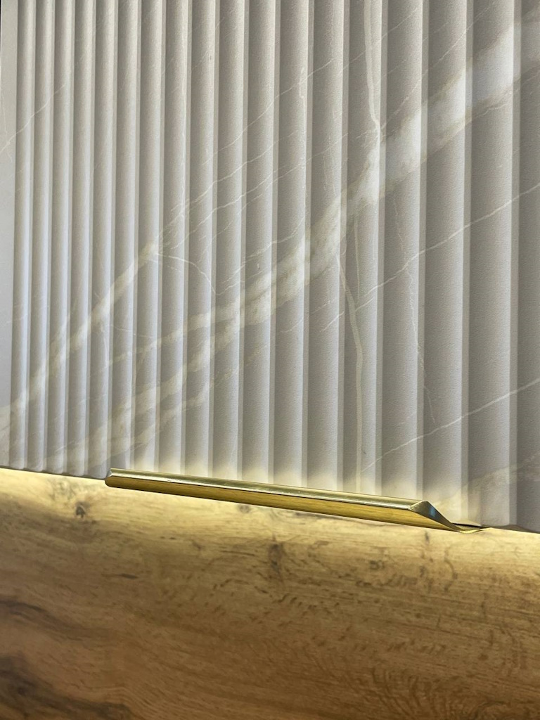 Вертикальная фрезеровка фасадов особенно влияет на восприятие всего интерьера, рельеф смотрится естественно, задавая дизайну помещения необходимый ритм. Строгая геометрия форм смотрится лаконично, современно и благородно, в лучших традициях итальянского стиля. Немаловажную роль также играет контраст цвета и фактуры.