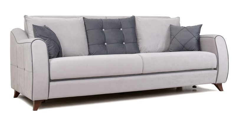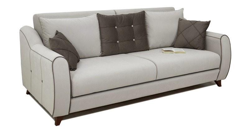 Характеристика: Каркас дивана выполнен из ЛДСП, фанеры, хвойного и березового бруса. Элементы сиденья и спальная часть из ППУ. Наполнитель подушек – полиэфирное волокно и крошка ППУ. Опоры - пластик.