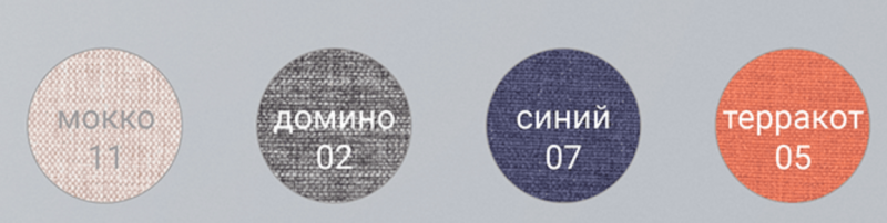Обивку: Мокко 11, Домино 02, Синий 07, Терракот 05