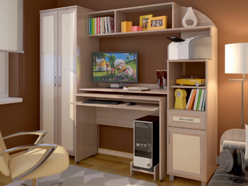 Стенка с массой достоинств! Вместительный шкаф для одежды, выдвижная столешница, выдвижная полка для клавиатуры, подставка под системный блок.