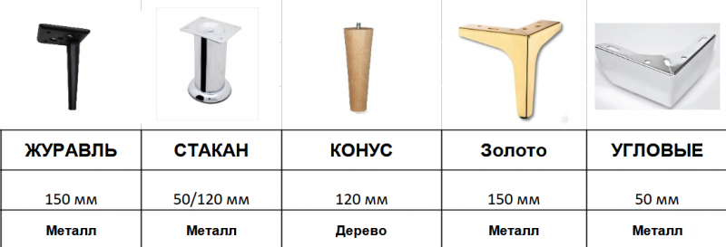 По умолчанию кровати комплектуются стандартными скрытыми опорами, дополнительно можно установить высокие либо декоративные опоры