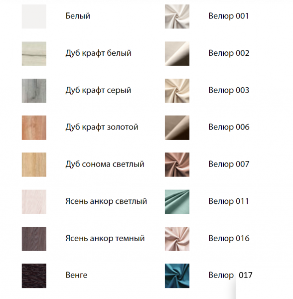Велюр: 001, 002, 003, 007, 011, 016, 017, 032