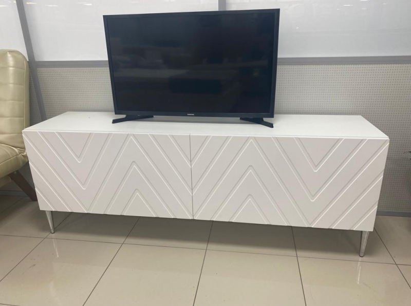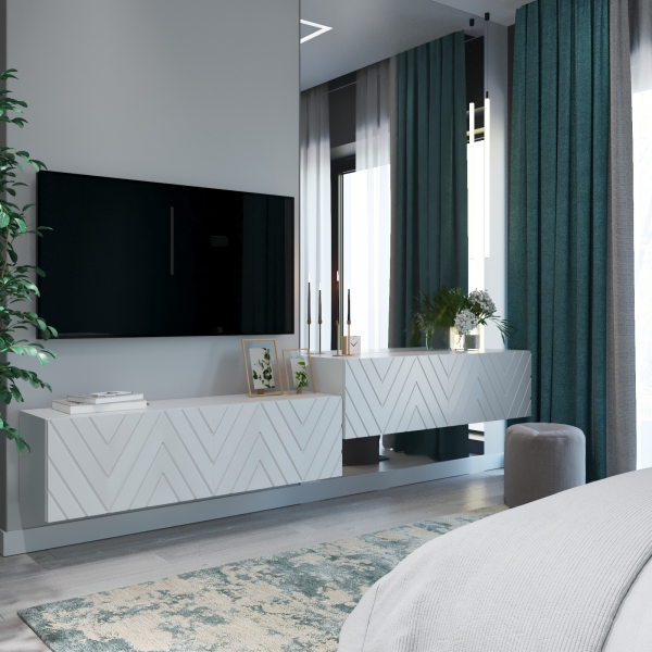 Элегантная тумба ТВ в модном, современном дизайне. Боковой шкаф открывается при нажатии (механизм push-to-open и газлифты с доводчиками), что позволяет отказаться от дверных ручек и сохранить шикарный дизайн, а также обеспечивает больший угол открывания. Тумба может быть выполнена в подвесном варианте.