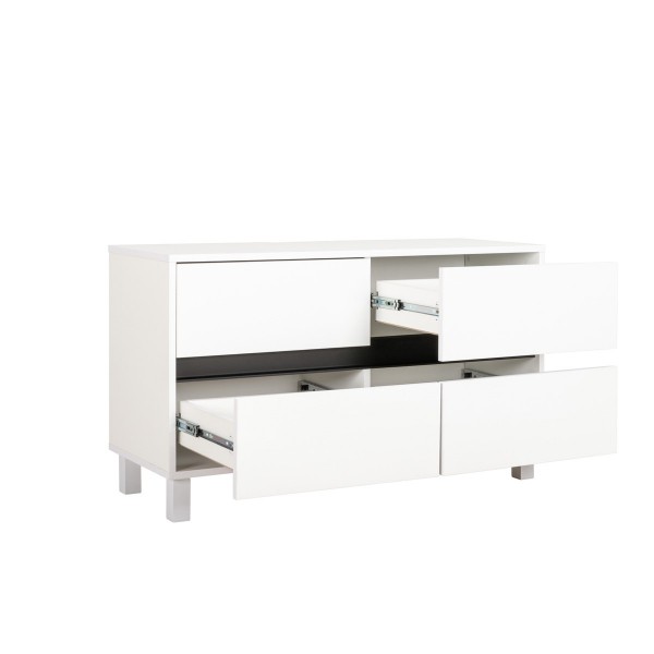 Продуманный функционал, лаконичный дизайн и минималистичность форм являются основными свойствами этой тумбы и позволяют ей отлично вписываться в любой интерьер.Корпус тумбы выполнен из белой плиты, выдвижные ящики графично разделены горизонтальной черной полосой из алюминиевого профиля. В столешнице имеется вырез под провода для удобства подключения мультимедиа техники, а регулируемые опоры легко компенсируют неровности пола.