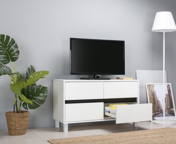 Четыре выдвижных ящика — вместительная система хранения. Шариковые направляющие — обеспечивают бесшумный и плавный ход ящиков. Регулируемые опоры — легко компенсируют неровности пола. Вырез под провода — облегчает подключение мультимедиа техники. Анодированный алюминиевый профиль — удобное и стильное конструктивное решение.