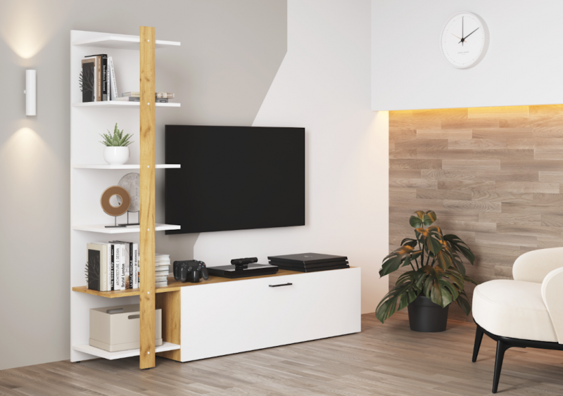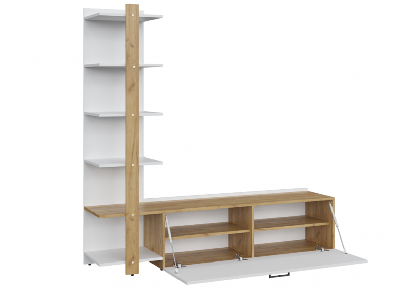 2. Тумба ТV.Габаритные размеры: 1214х372х362 мм. Закрыта единым фасадом, имеющим барный механизм открывания. Имеет внутреннюю перегородку, разделяющую тумбу на две равные части, и две несъемные внутренние полки. Нагрузка на тумбу - не более 30кг при равномерно распределённых статичных нагрузках. Столешница тумбы: ЛДСП — Дуб Крафт золотой. Размер 1600х362мм. Кромка 0,4 мм по 4-ем сторонам. Задняя панель столешницы: цвет — белый гладкий. Выступает относительно плоскости стола на 20мм вверх. Сбоку Панель устанавливается вровень с корпусом.